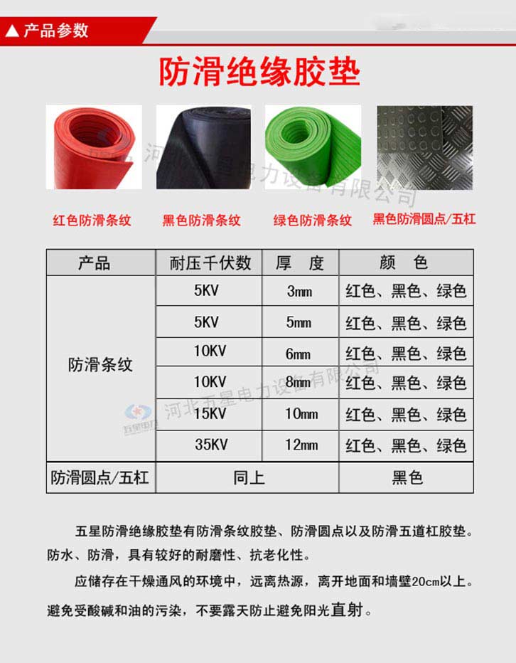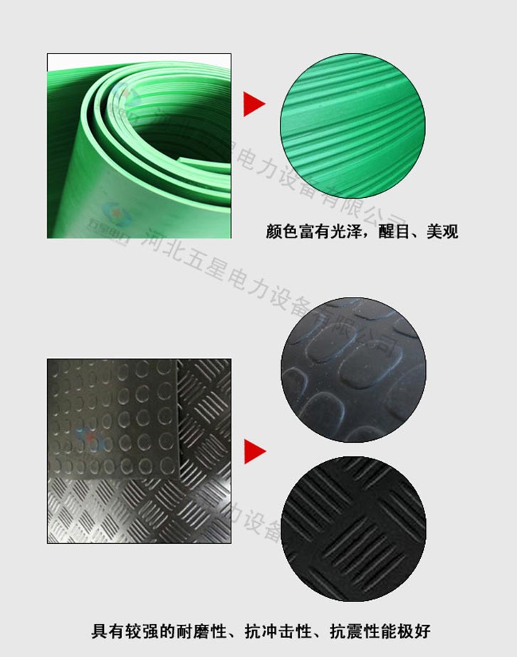 防滑絕緣膠墊產品分為防滑圓點、防滑條紋。 不含雜質:原生橡膠材質,不含次生膠,切面不會有粉末, 柔韌性好:具有優良的絕緣性能,彈性強,拉伸強度大 光澤度高:原生橡膠材質,無任何塑料成分,表面光澤度高 無氣泡:五星電力絕緣膠墊,表面無氣泡,無裂痕